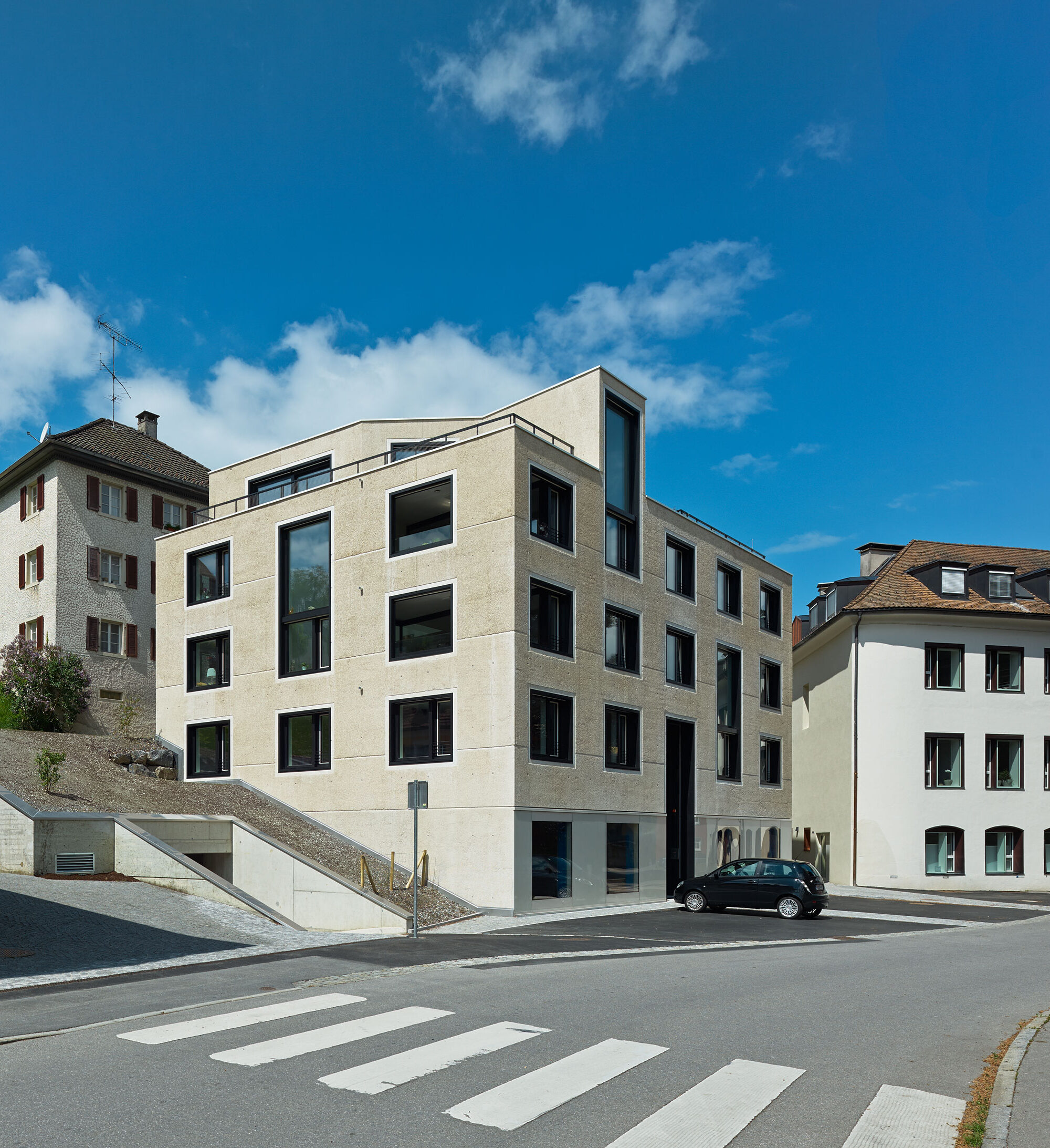 Der weiße mit Jura Kalk vermengte Sichtbeton der äußeren Hülle wurde abgewaschen und ist plastisches Ausdrucksmittel dieses Stadthauses auf knappem Grund. Nur die Fenster erhielten eine glatte Laibung. Die dunkel eloxierten Fenster in diesen Nischen liegen in verschiedenen Ebenen. Diese technisch präzise Tektonik tritt mit der haptischen Porosität des Sichtbetons in ein Spannungsfeld, das erst auf den zweiten Blick erkennbar wird.