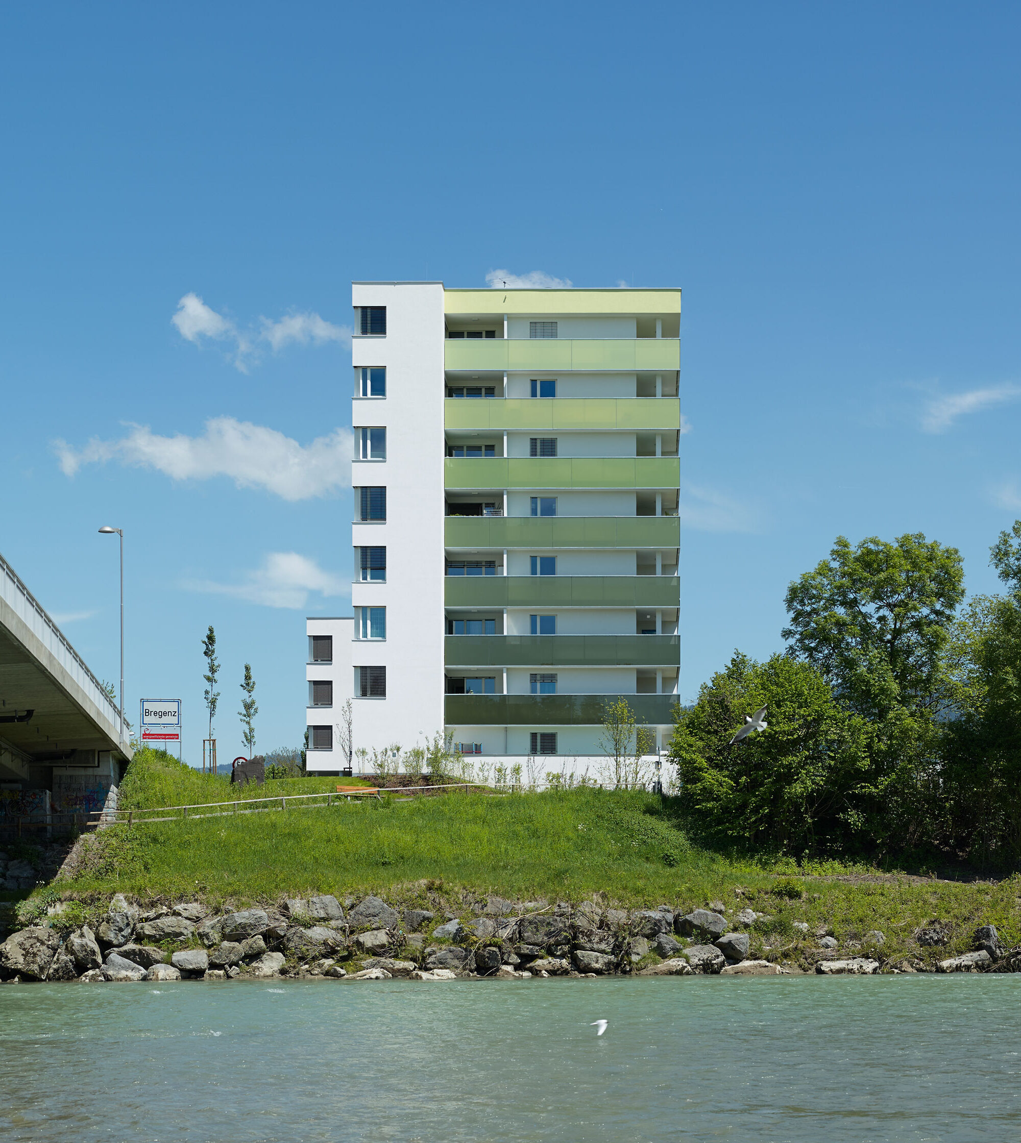 Die Überlegungen zur Bebauung der GP.1577 - 2161/5 - 2161/3 schließen nahtlos an dieses Prinzip an. Vier Baukörper umschließen höhengestaffelt (E+2 / E+3 / E+4 /E+8) einen Hof der sich zum Grünraum Bregenzer Ache öffnet. Die Baukörper entlang der Rheintrasse sind gleich der Südtiroler Siedlung vom Straßenraum zurückgesetzt, die bestehende Pappelreihe wird verlängert und verschmilzt mit dem Grünraum der Bregenzer Ach.